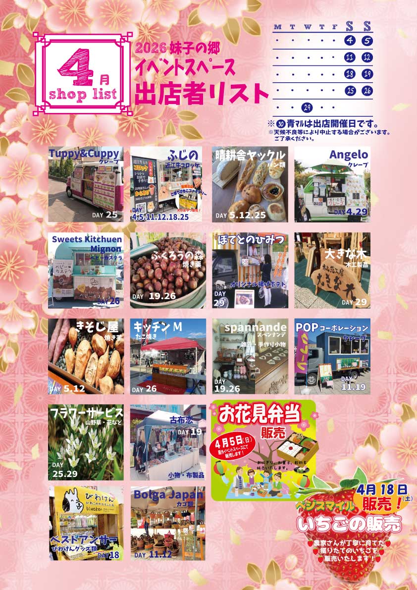 2026.04.01 4月の屋外出店のご案内 お知らせイベント 4月の屋外出店のお知らせ土日祝日は屋外イベントスペースにキッチンカーやテントが並び、フードや雑貨などいろいろな販売を致します。ぜひお立ち寄りください!! 一覧へ戻る