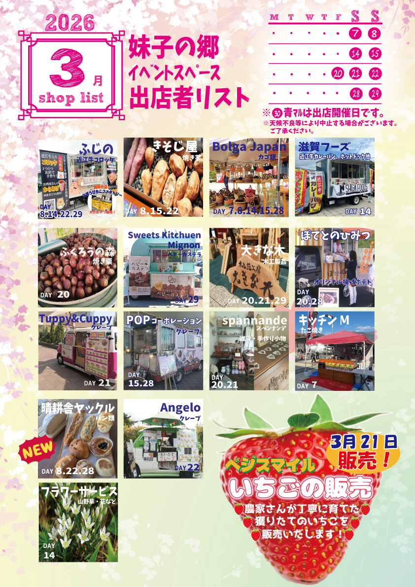 2026.03.01 3月の屋外出店のご案内 お知らせイベント 3月の屋外出店のお知らせ土日祝日は屋外イベントスペースにキッチンカーやテントが並び、フードや雑貨などいろいろな販売を致します。ぜひお立ち寄りください!! 一覧へ戻る