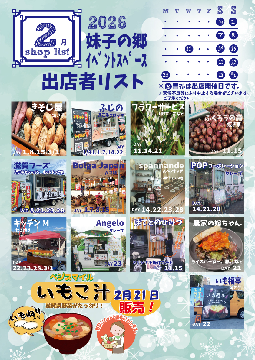 2026.01.26 2の屋外出店のご案内 お知らせイベント 2月の屋外出店のお知らせ土日祝日は屋外イベントスペースにキッチンカーやテントが並び、フードや雑貨などいろいろな販売を致します。ぜひお立ち寄りください!! 一覧へ戻る